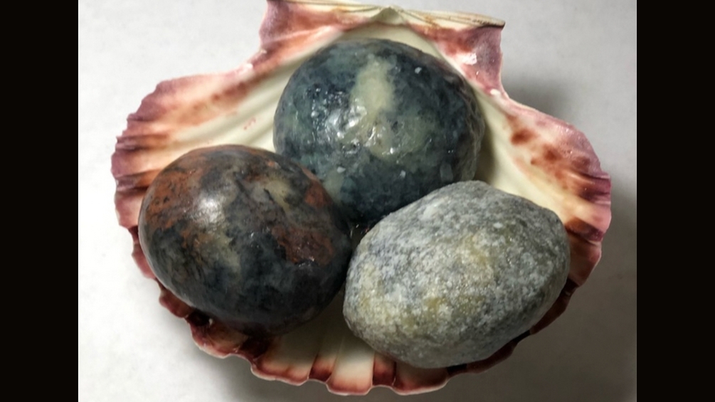 Made from organic soap factory waste cuts and activated charcoal. Assorted pebbles contain skin-conditioning red, green and yellow clays.